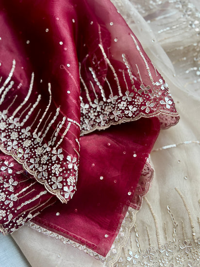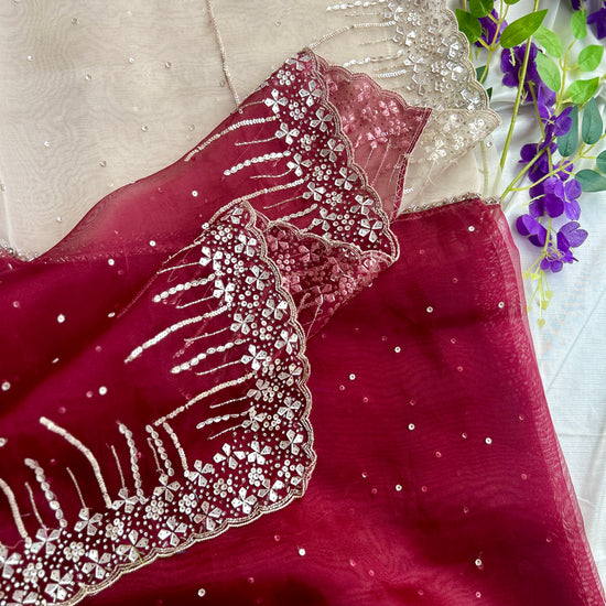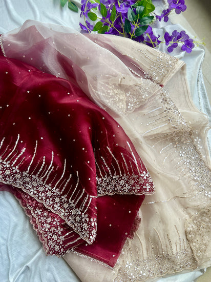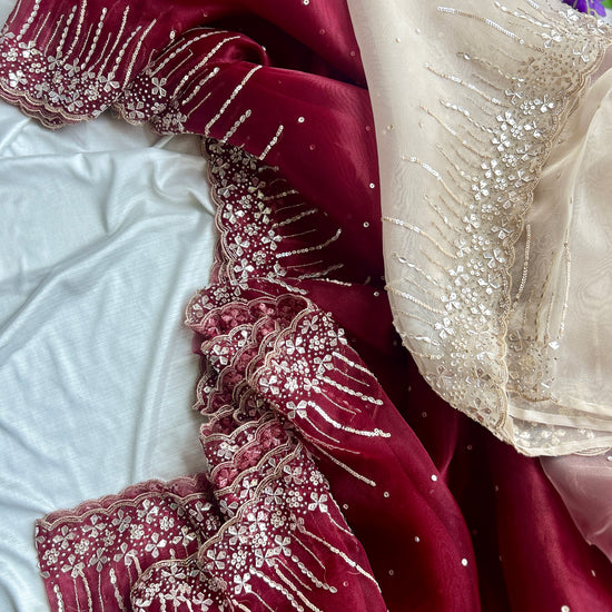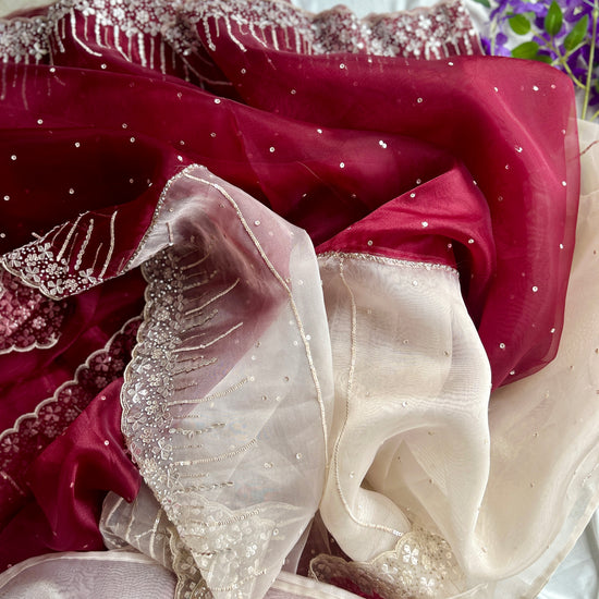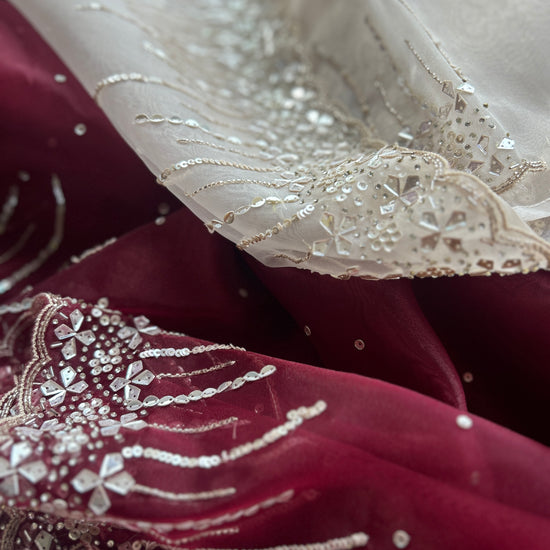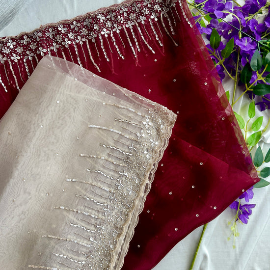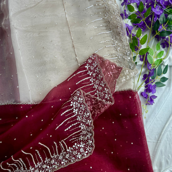 Maroon and Perl Colour Hand Embroidery on Organza Sari
