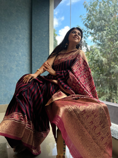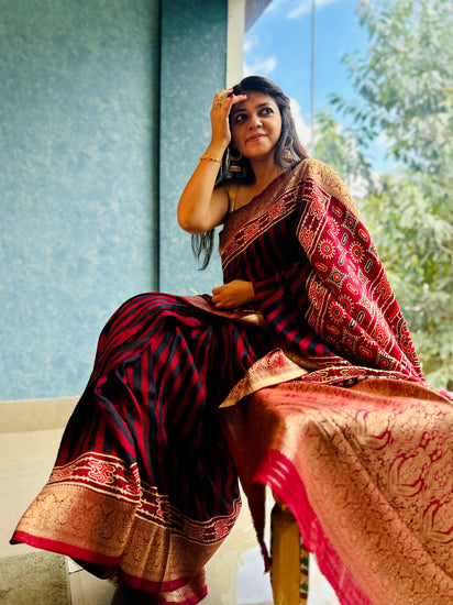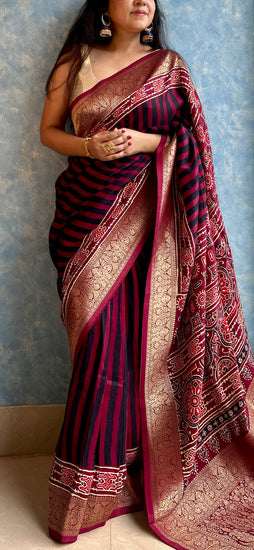 MAROON & BEIGE STRIPES DOLA SILK AJRAKH HANDBLOCK PRINT SARI WITH BANARASI BORDERS AND BEAUTIFUL ZARI PALLA .