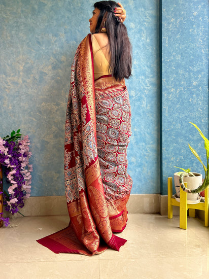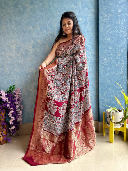 MAROON AJRAK BLOCK PRINTED DOLA SILK SARI