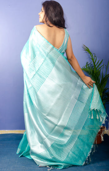 Bright Turquoise Pure Woven Tissue Linen Sari with self-work.