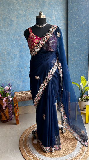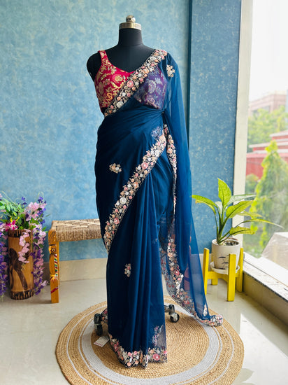 Beautiful hand embroidery with cutdana and perl on pure midnight blue shades organza Sari