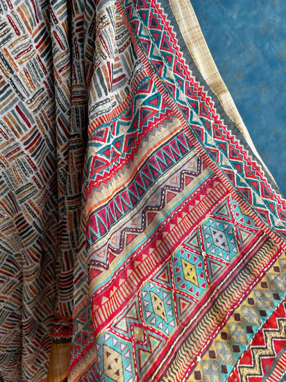 Multi color Linen Digital Print with Kantha stitch