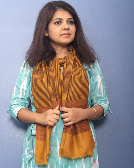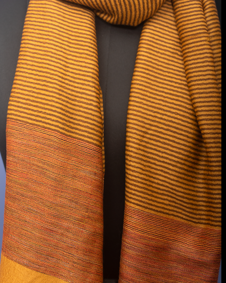 Mustard Color Pure Pashmina stole with brown stripe on it.