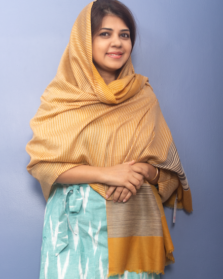 Mustard Color Pure Pashmina stole with beige stripe on it.