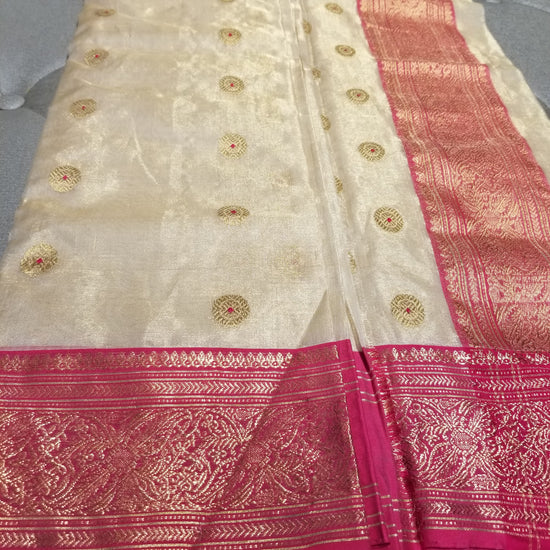 Off-White Chanderi Handwoven Pure Silk by Tissue Sari with Deep Pink Border and allover zari buta work.