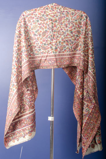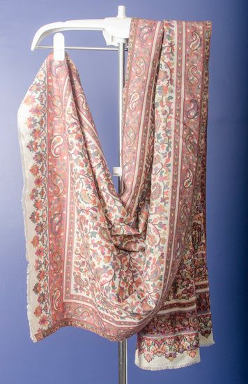 Pure Pashmina off white color Kani stole woven in authentic Kani technique using Kanis (wooden needles).