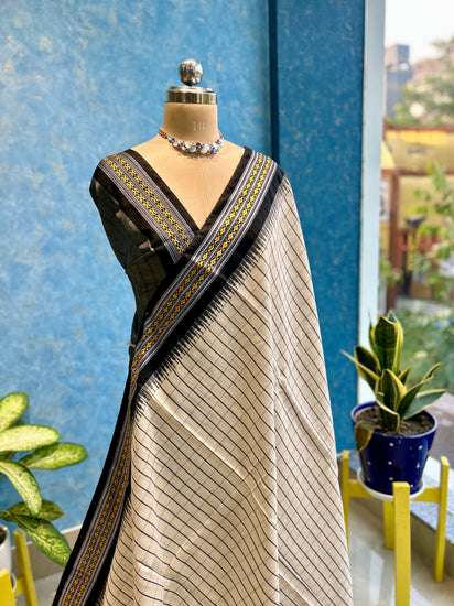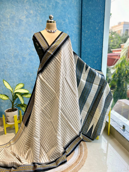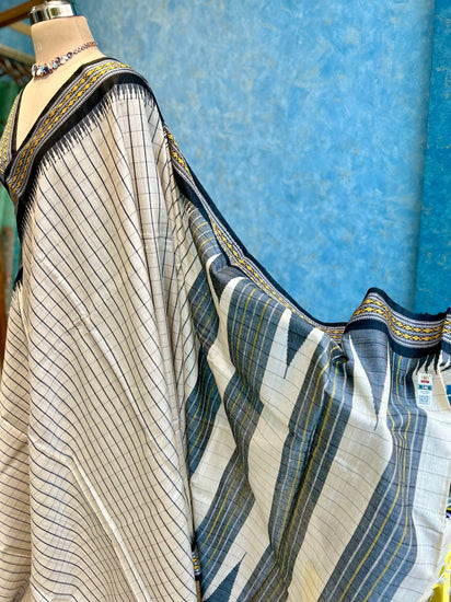 Off white checks Pure Tusser Silk with beautiful Black weaved border and Palla.