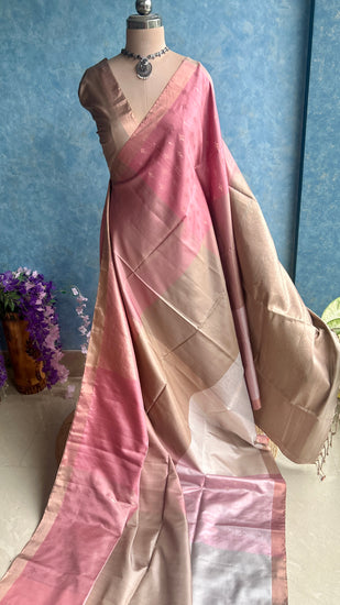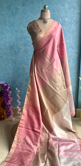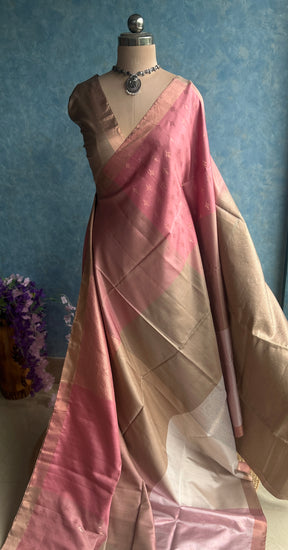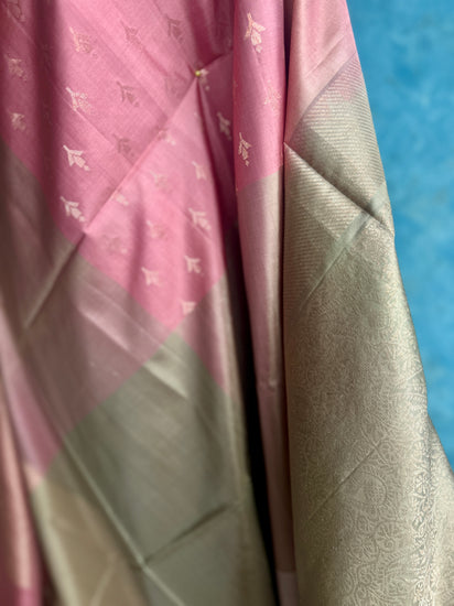 Pastle Kanchipuram Silk Saree with Zari Buta on the body and Zari Border. Includes unstitched blouse.