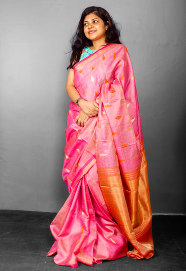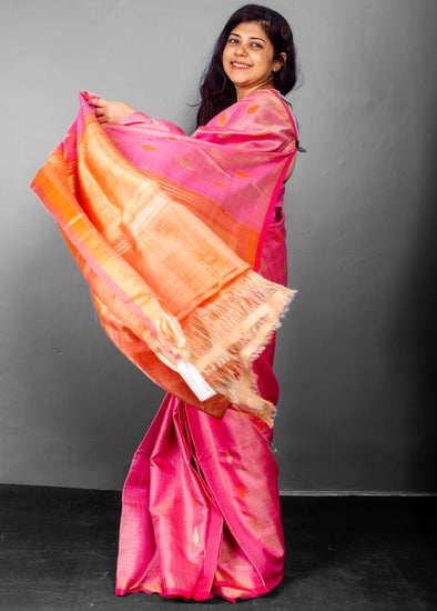 Peach Pure Woven Tissue Tussar Silk Sari With Beautiful Motifs and Orange Rich Pallu