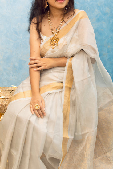 Perl White Tissue Tussar Silk Sari