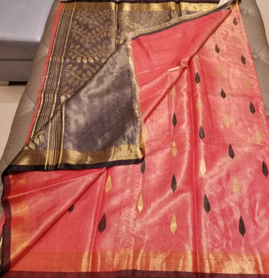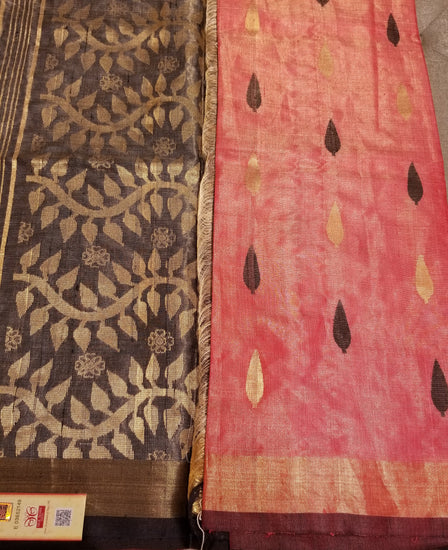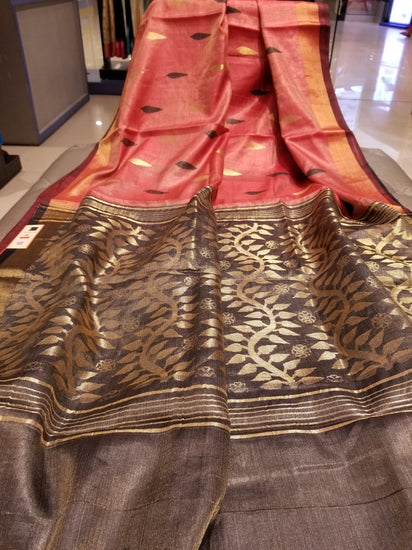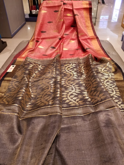 Pure tissue tussar silk sari in beautiful reddish grey color, handwoven with motifs.