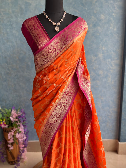 Orange pink Crepe Banarasi Saree with all over jaal and beautiful weaved pallu .