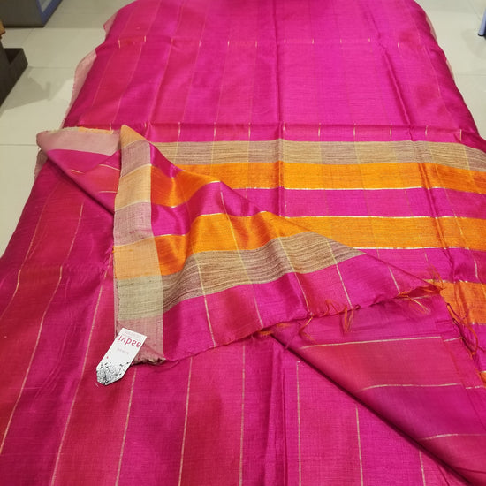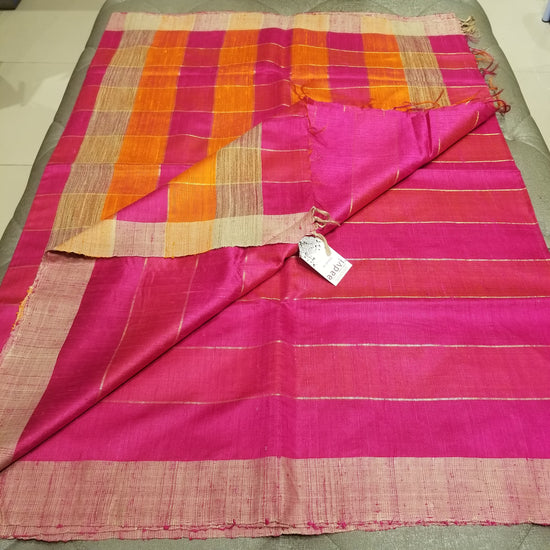 Pink Pure Dupion Silk Handwoven Sari with beautiful combination of Orange and Pink color on the Pallu . Sari has allover stripes and checks on pallu.