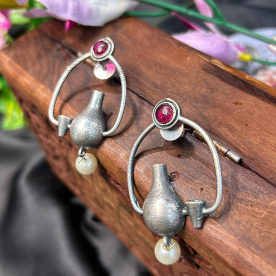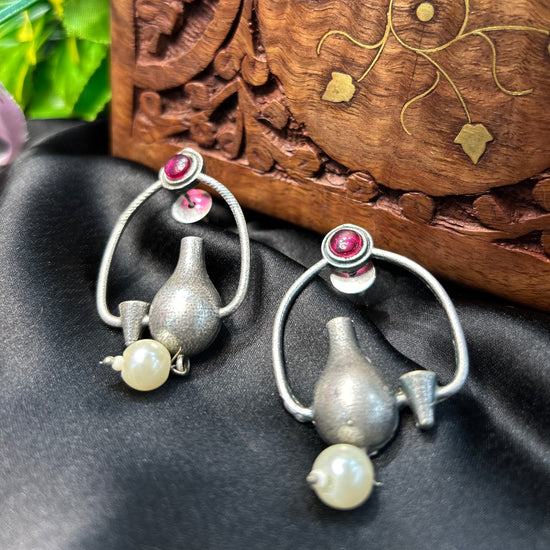 Pink Stone Silver Oxidised Earrings