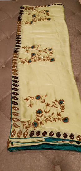 Pista green satin saree with contrasting black and golden border embroidered with sequins and cutdana. And floral motif embroidery on Pallu and bottom of the sari.