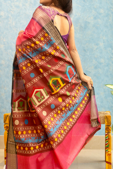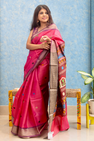 Exclusive handwoven tussar saree Pink base with butta in body with beautiful Dolabedi palla.