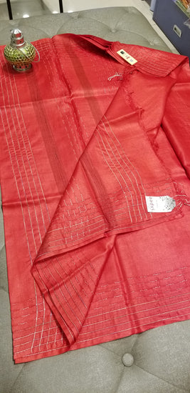 Pure tussar silk sari in beautiful red color, handwoven with stripes on border and pallu.