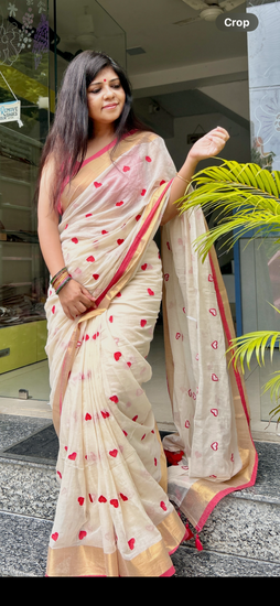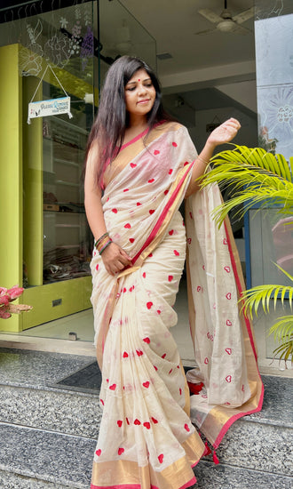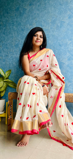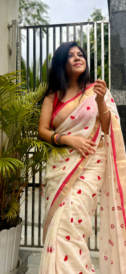 Mul Cotton Sarees with a charming contrast heart thread butta design and vibrant tassels that add the perfect festive touch!