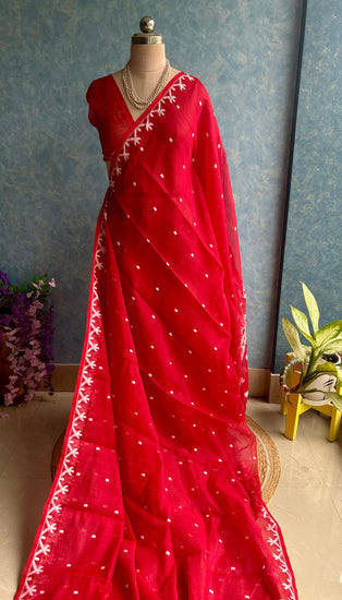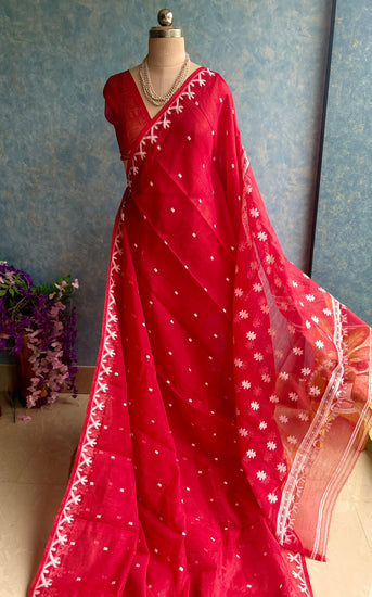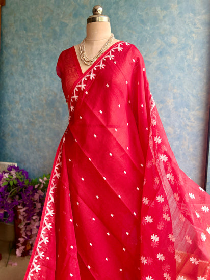 A very beautiful soft Jamdani Saree in red white color with Resham butas all over.