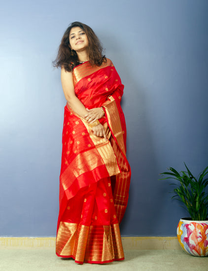 Tomato Red Chanderi Handwoven Pure Silk by Silk Sari with Golden Border and allover zari with meenakari buta work.