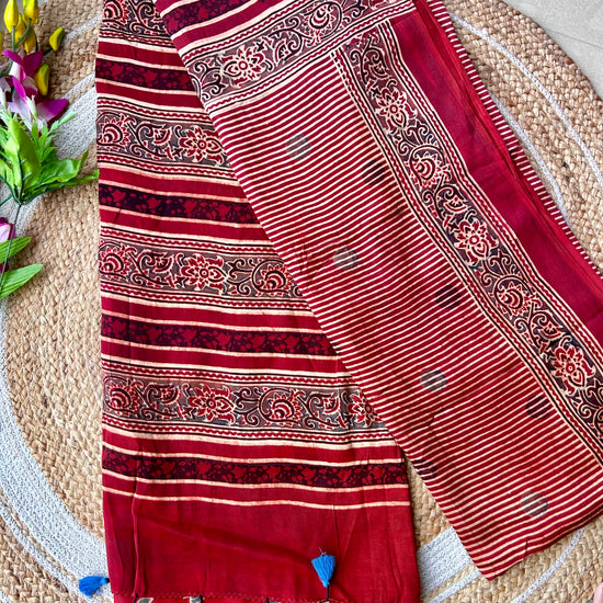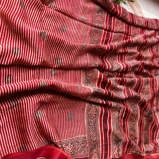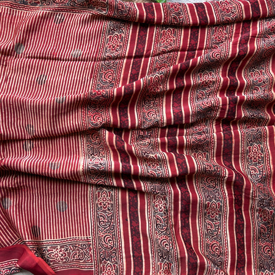 RUSTIC RED STRIPE MODAL SILK AJRAKH HANDBLOCK PRINT SARI WITH UNIQUE PATTERN ON BORDERS AND BEAUTIFUL PALLA , ACCESSORISED WITH TASSLES.