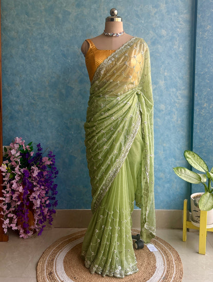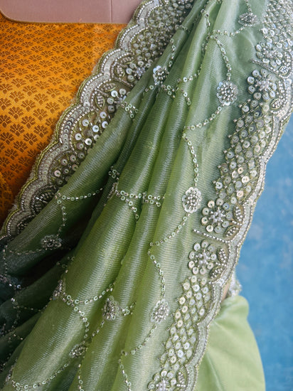 Beautiful hand embroidery with cutdana and perl on pure Tissue Sari