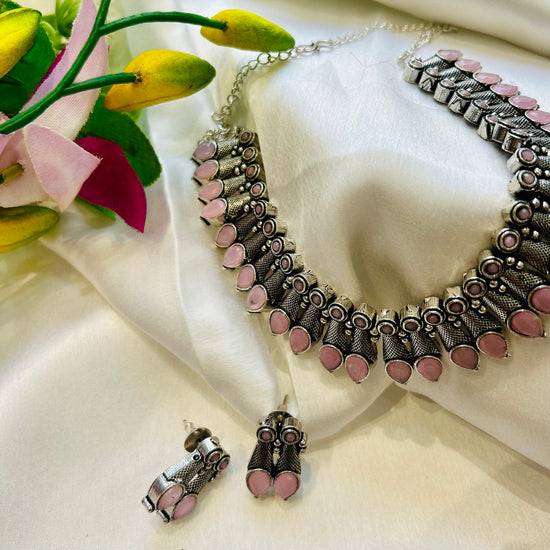 Baby Pink Silver Look Alike Oxidised Necklace Set