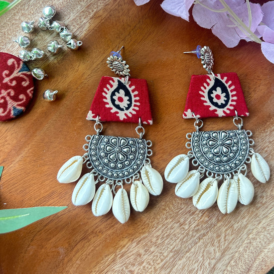 Handmade ajrakh fabric Earrings with Silver Plated Oxidised and Kori (shell )Contemporary Drop Earrings