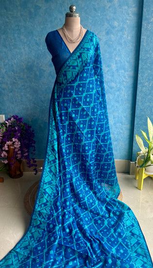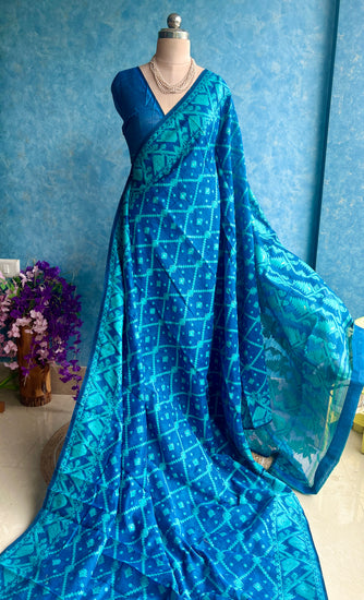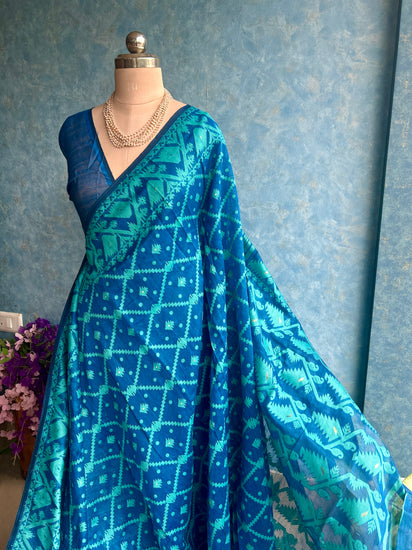 A very beautiful soft Jamdani Saree in peacock blue color with Resham work all over.