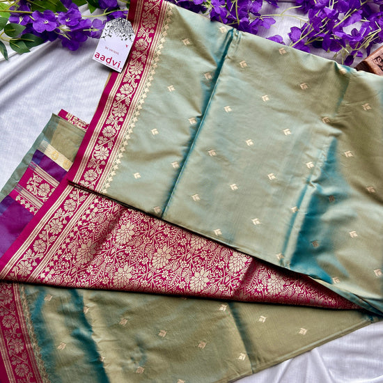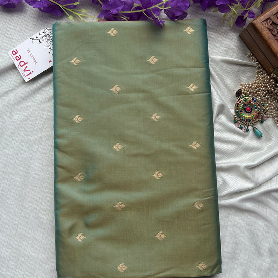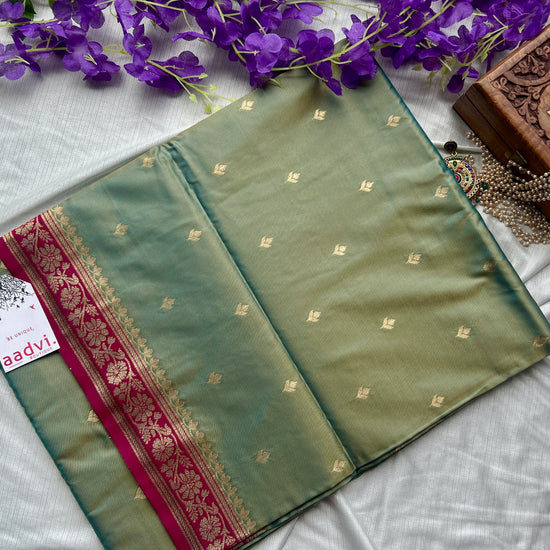 Embrace traditional Indian fashion with a modern twist in this stunning Lovely dual tone silt green Soft Silk Saree. The soft silk fabric is light and breathable, ensuring all-day comfort. The intricate design and delicate embellishments exude grace and finesse, making it a standout piece in your collection.