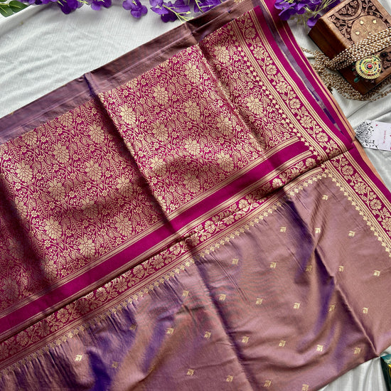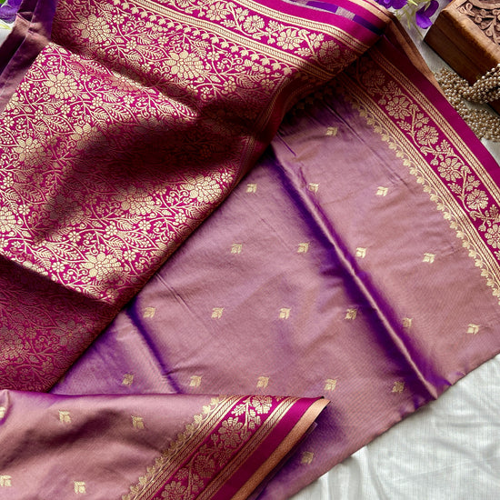 Embrace traditional Indian fashion with a modern twist in this stunning Lovely dual tone opera mauve Soft Silk Saree. The soft silk fabric is light and breathable, ensuring all-day comfort. The intricate design and delicate embellishments exude grace and finesse, making it a standout piece in your collection.