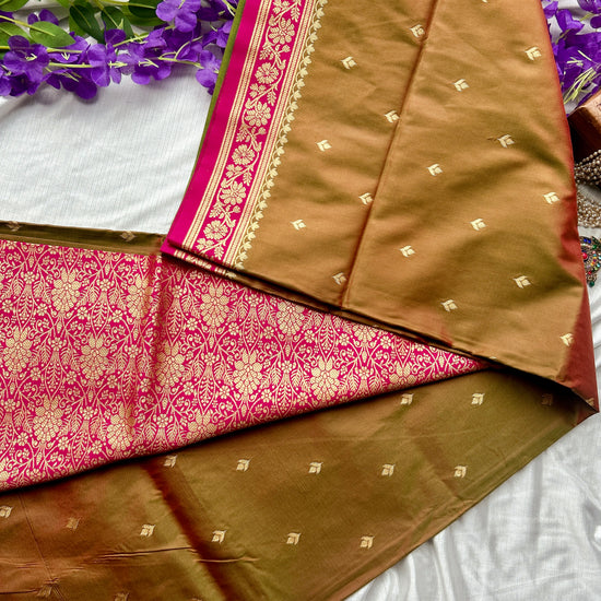Embrace traditional Indian fashion with a modern twist in this stunning Lovely dual tone olive Soft Silk Saree. The soft silk fabric is light and breathable, ensuring all-day comfort. The intricate design and delicate embellishments exude grace and finesse, making it a standout piece in your collection.