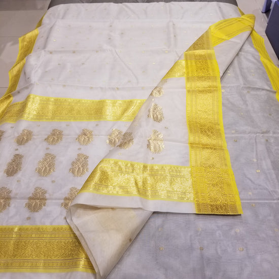 White Chanderi Handwoven Pure Silk by Silk Sari with Yellow Border and allover zari buta work.