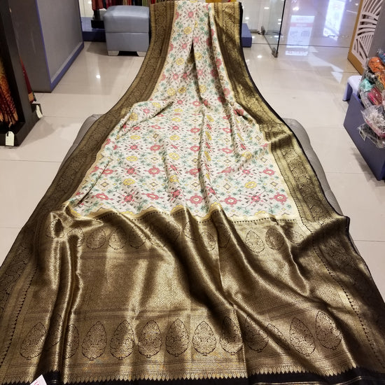 White Double Border Silk Ikkat Sari with Black Banarasi Pallu