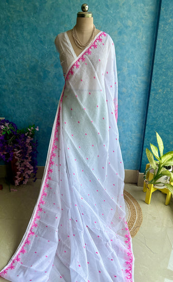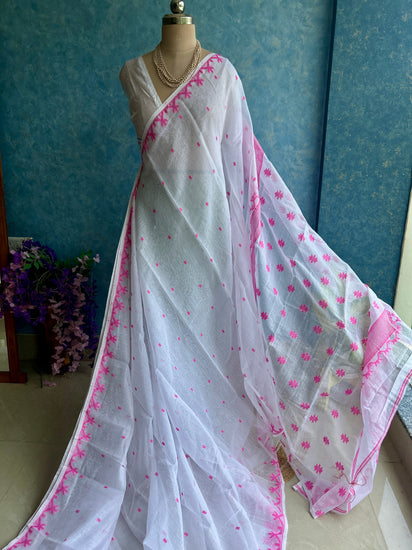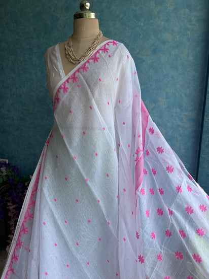 A very beautiful soft Jamdani Saree in white and pink combination with Resham butas all over.
