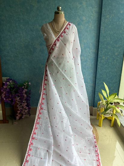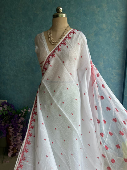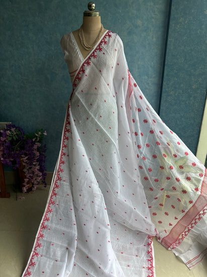 A very beautiful soft Jamdani Saree in white red color with Resham butas all over.