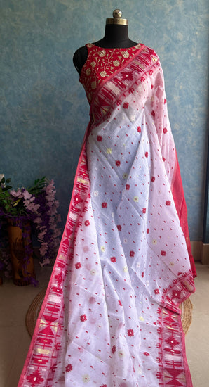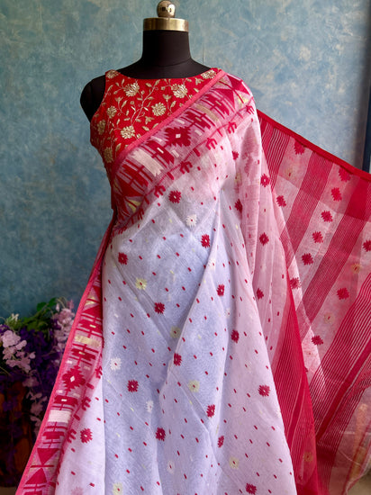 A very beautiful soft Jamdani Saree in white red color with Resham butas all over.