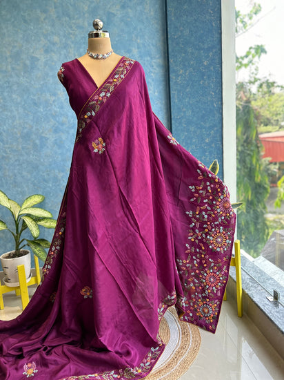 Wine color Silk Chinon Saree with beautiful French knot thread embroidery Buta on Body and Palla