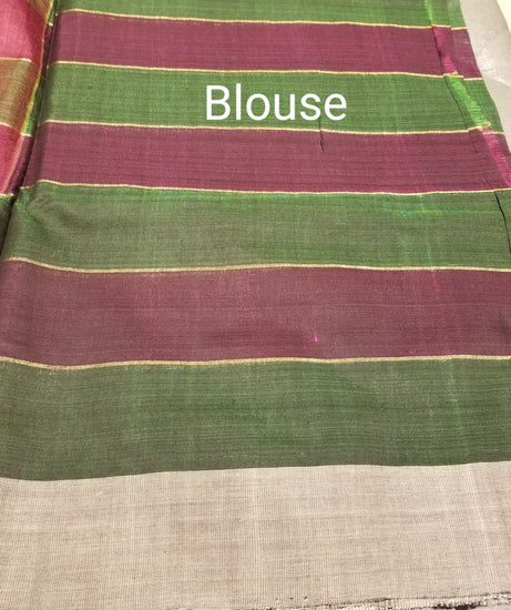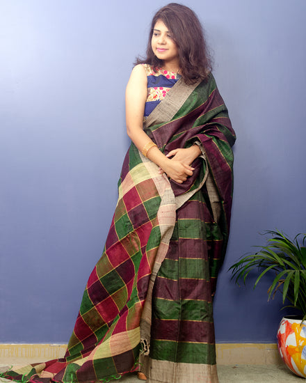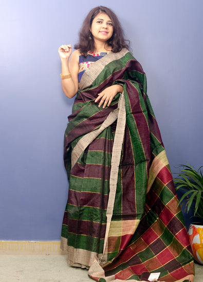 Alternating Wine Green striped Pure Dupion Silk Handwoven Sari with multi colored checkered pallu