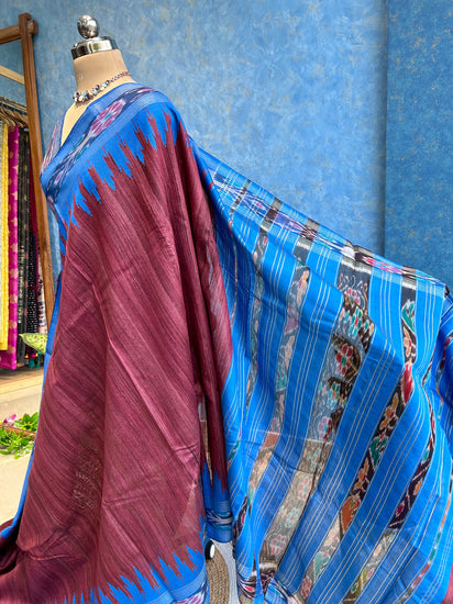 Blue Ikkat border on chocolate brown Pure Ghicha Silk with beautiful Ikkat palla.