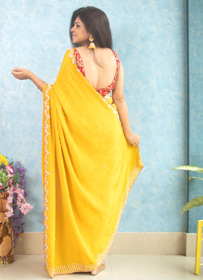 Yellow crape saree with hand work with golden cutdana and white Moti also finished with beautiful contrast red thread scallop Border.
